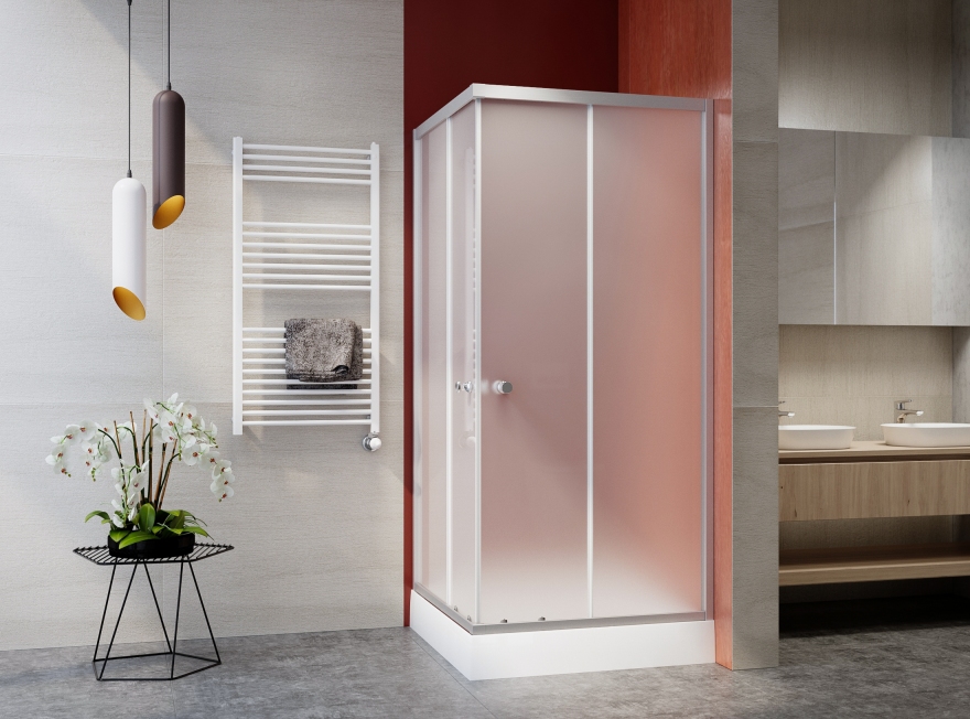 Szögeletes zuhanykabin 90x90x185cm 5 mm vastag , katedrál biztonsági üvegek és ajtók. Polírozott profilok. Mágneses ajtózár. Görgős ajtónyitás. Krómozott fogantyúk. A mintázott üveg részben átlátható, így biztosítja az intim teret a zuhanyzás során anélkül, hogy teljesen elzárna.