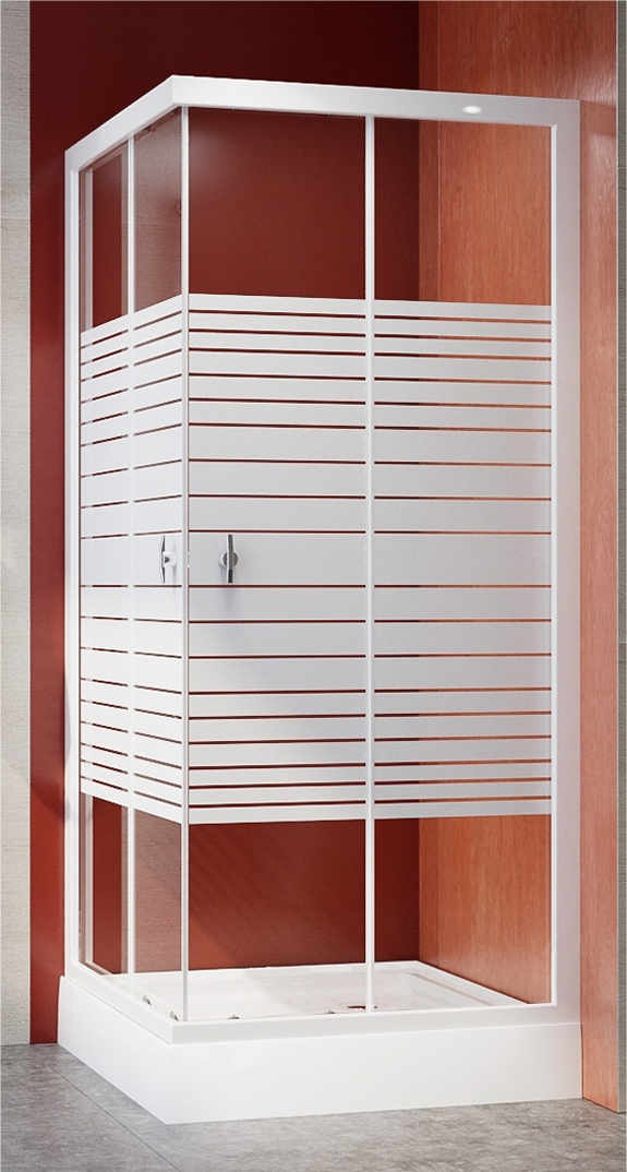 Szögletes sarokkabin zuhanytálca nélkül 100x100x185cm Fehér profilok. Keskeny csíkos, 6 mm biztonsági üvegek. Mágneses ajtózár. Görgős ajtónyitás Kabin beépítési mérete:98x98x185cm
